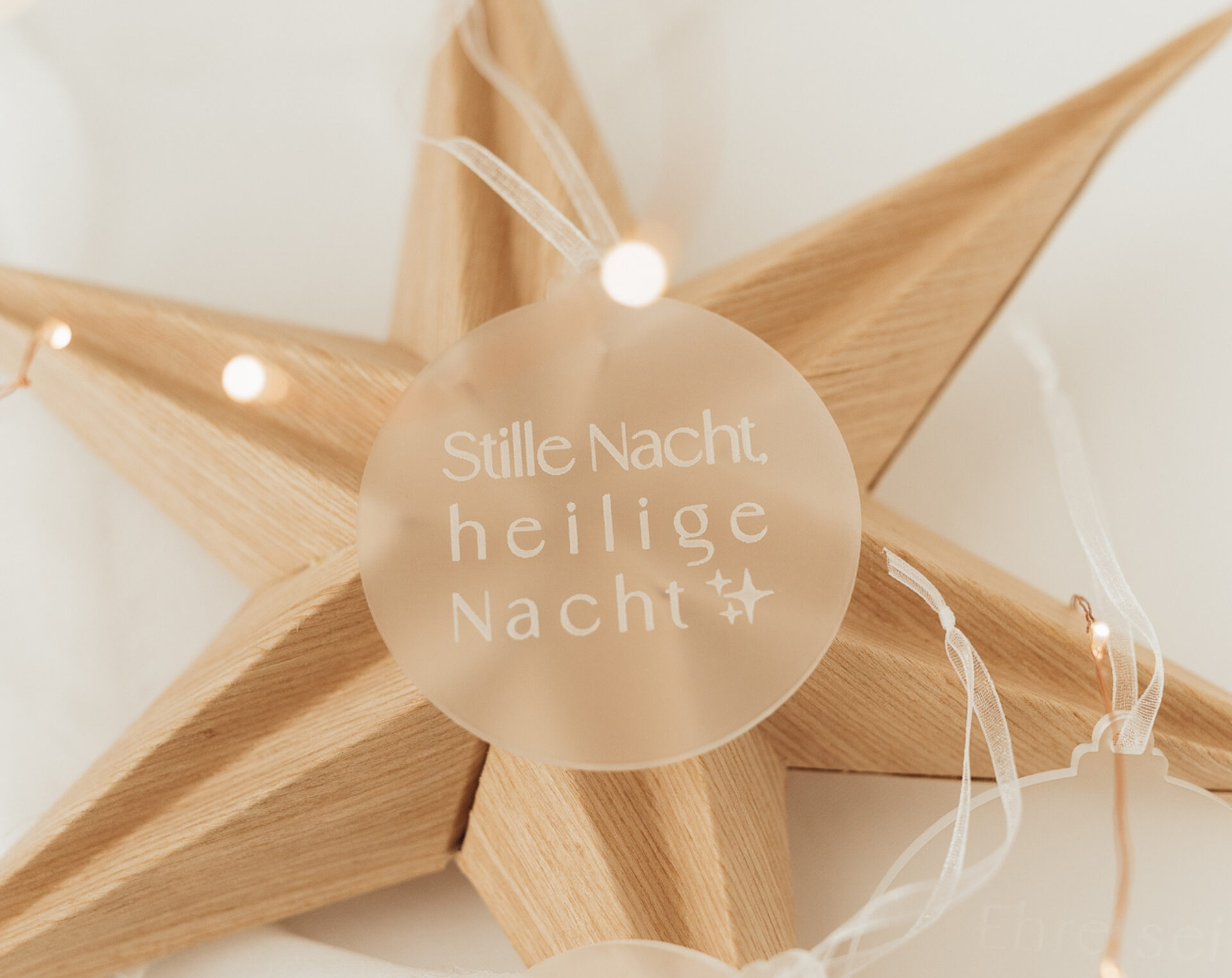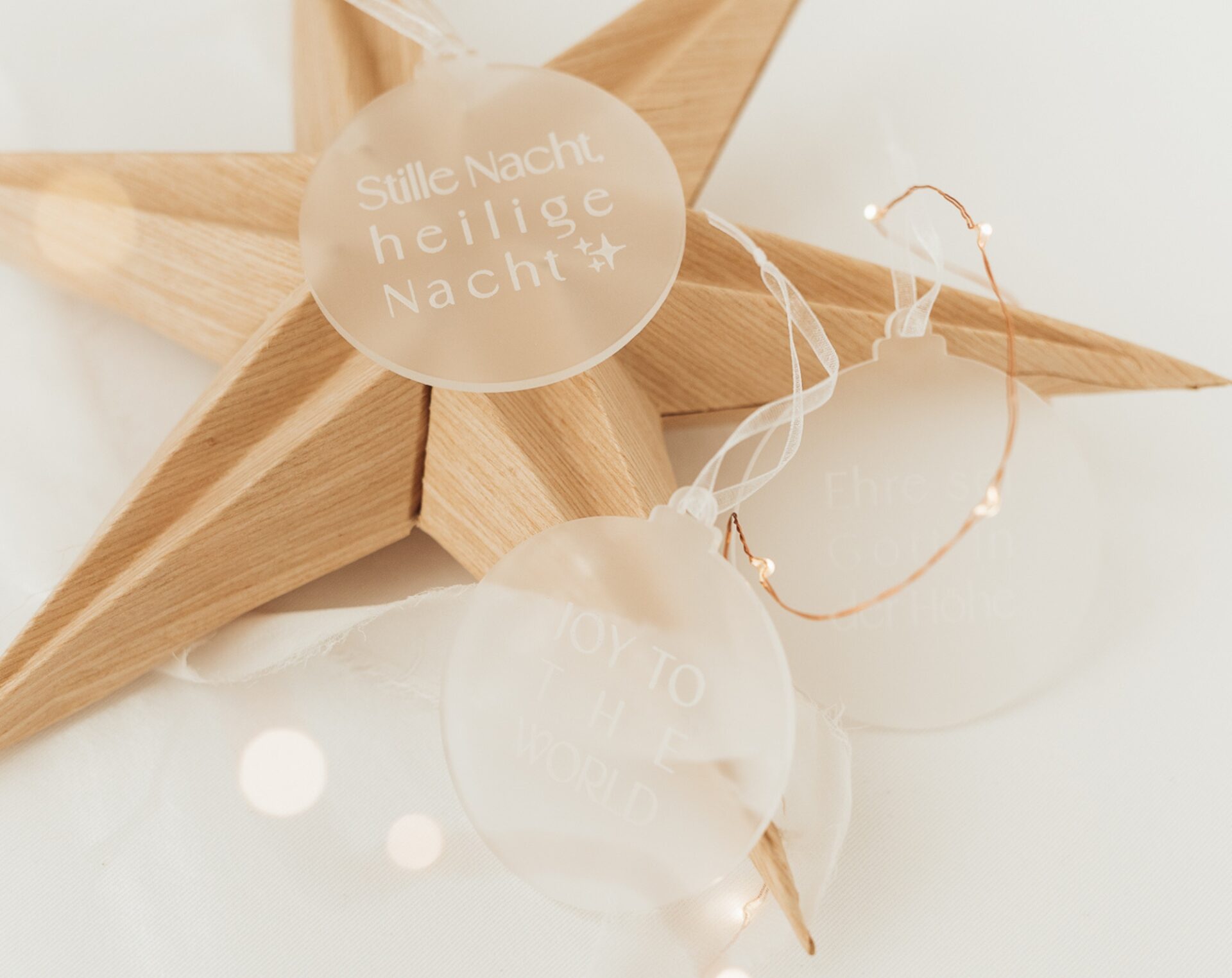 Diese zarten Acrylanhänger bestechen mit ihrer schlichten Eleganz und verleihen deiner Weihnachtsdeko einen ganz besonderen Charme. Als Baumschmuck oder Geschenkanhänger sind diese gravierten Christbaumkugeln aus mattem Acryl das besondere Highlight! Jeder Anhänger ist echte Handarbeit.